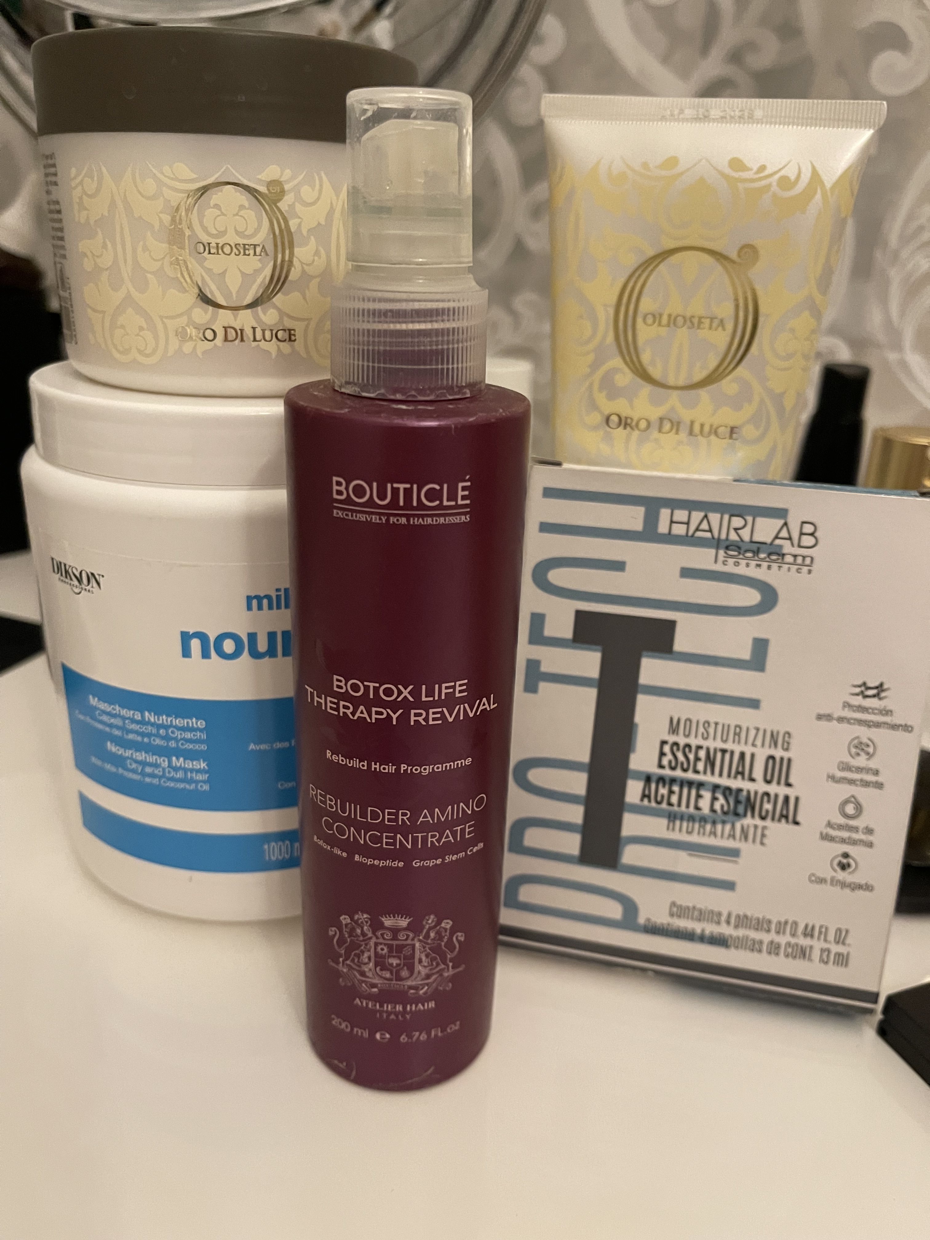 Для меня просто деньги на ветер. Совсем продукт не подошел волосы тонкие осветленные вьющиеся длинные. Нужен протеин глицерин гилауронка кератин. Рекомендую попробовать ампулы очень мне подходят Salerm синии или Dikson тоже супер для меня. Фото прилагаю.
