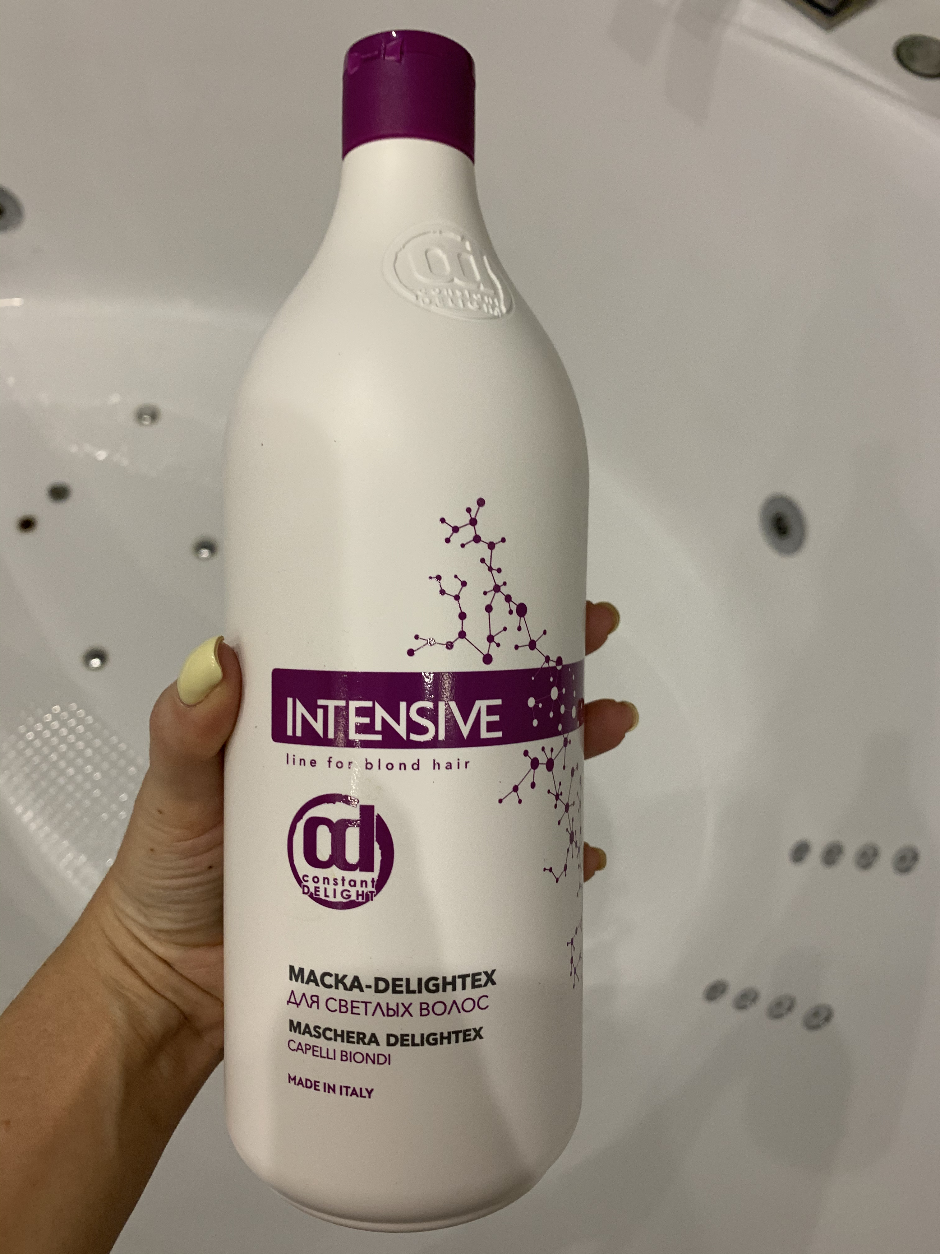Маска обладает увлажняющими и защитными свойствами, делает локоны здоровыми, сильными и потрясающе красивыми. Основная сила маски заключается в уникальном комплексе - Myrustyle X-HP. Он на клеточном уровне воздействует на каждый волосок, устраняет сухость и ломкость по всей длине, укрепляет кончики, придает волосам гладкость и эластичность, а также уберегает от потери влаги. После ухаживающей процедуры с маской Intensive Maschera Capelli Biondi волосы максимально долго удерживают влагу и не теряют ее даже во время стайлинга термо-инструментом. Компонент Delightex – коктейль из пигментов фиолетового спектра, корректирует оттенок блондированных прядей, придает им приятный холодный нюанс и отлично убирает нежелательную желтизну.