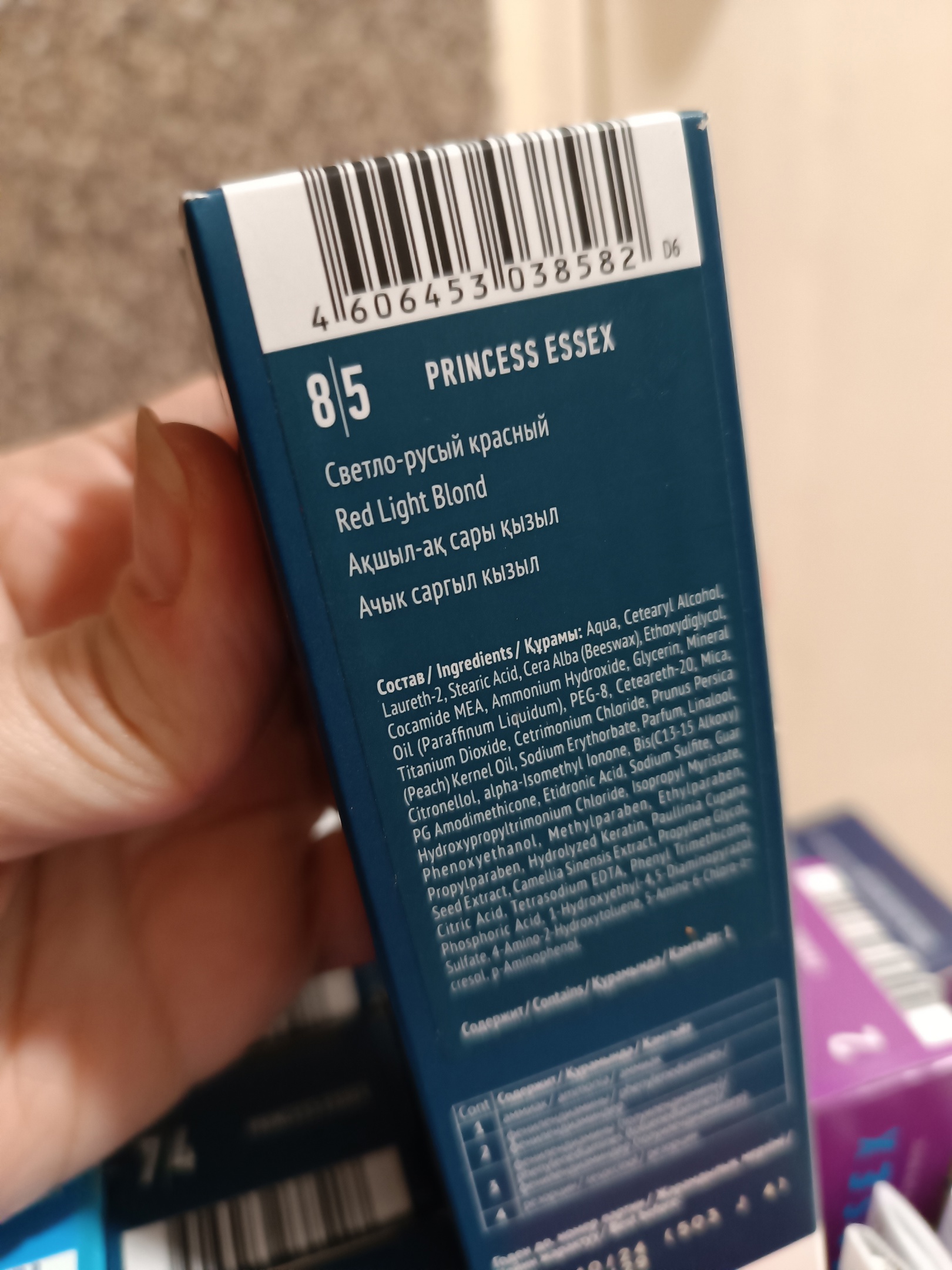 Aqua; Cetearyl Alcohol; Stearic Acid; Cera Alba (Beeswax); Cocamide MEA; Laureth-2; Mineral Oil (Paraffinum Liquidum); Ethoxydiglycol; Ceteareth-20; PEG-8 Distearate; Prunus Persica (Peach) Kermel Oil; Hexyldecanol; Hexyldecyl Laurate; Cetrimonium Chloride; PEG-8; Glycerin; Mica; Titanium Dioxide; p-Phenylenediamine; Bis (C13-15 Alkoxy) PG Amodimethicone; Parfum; Linalool; Citronellol; alpha-Isomethyl Ionone; Ammonium Hydroxide; Etidronic Acid; Phenoxyethanol; Methylparaben; Ethylparaben; Propylparaben; Sodium Erythorbate; Sodium Sulfite; Guar Hydroxypropyltrimonium Chloride; Hydrolyzed Keratin; Paullinia Cupana Seed Extract; Camellia Sinensis Extract; Sodium Hydrosulfite; Tetrasodium EDTA; m-Aminophenol; 2-Amino-4-Hydroxyethyl-aminoanisol Sulfate; Phosphoric Acid.