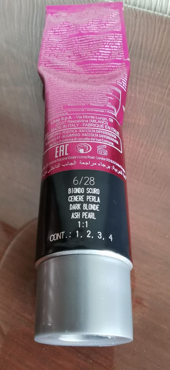Долго не могла подобрать краску для волос, мастер посоветовала 6/28 - у меня волосы ближе к серо-коричневому цвету волос, холодный оттенок. Данный цвет подошёл отлично! Использую на прикорневую зону волос, седину закрашивает прекрасно. Краска легко наносится, хорошо держится на волосах, волосы не портит, и даже как будто питает.