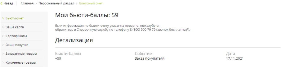 2. В Личном кабинете в разделе «Бьюти-счет» отражается полная детализация по начислению и списанию Ваших бьюти-баллов.