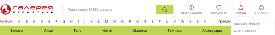 1. Чтобы увидеть количество накопленных бьюти-баллов, наведите курсор на значок Личного кабинета в «шапке» сайта.