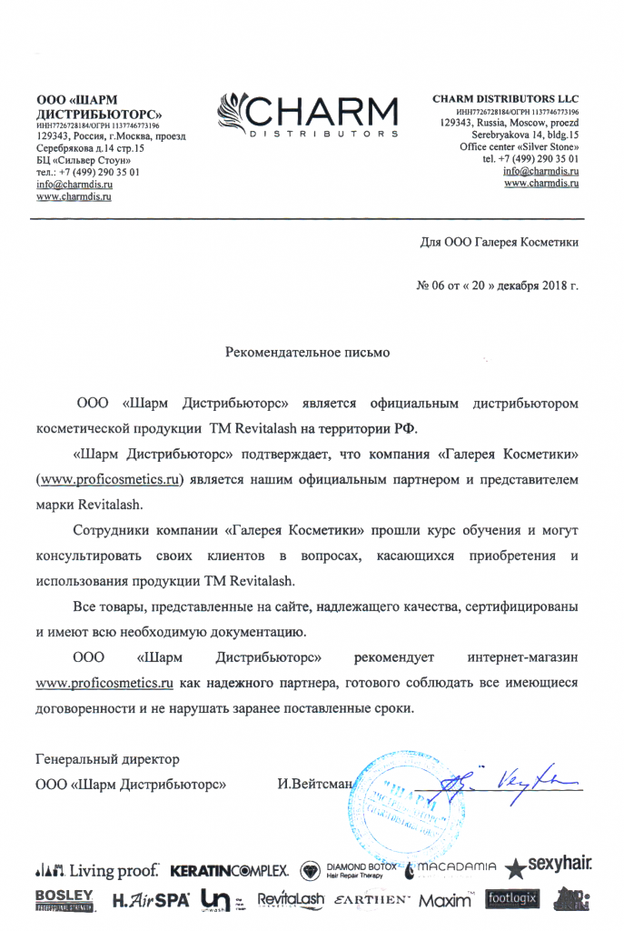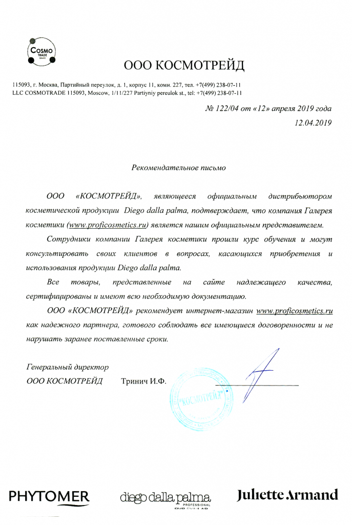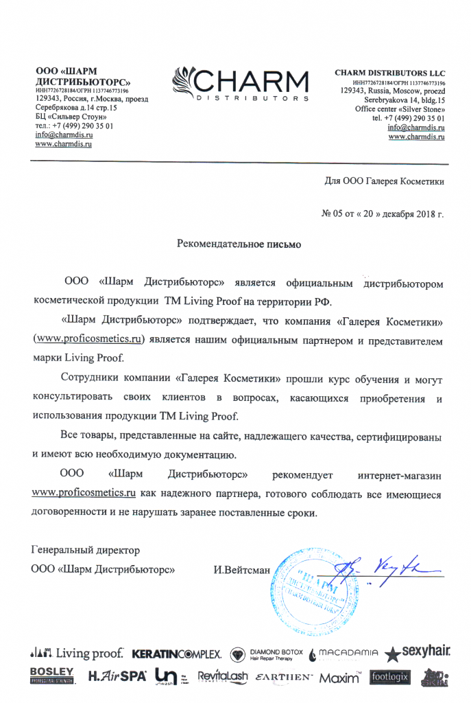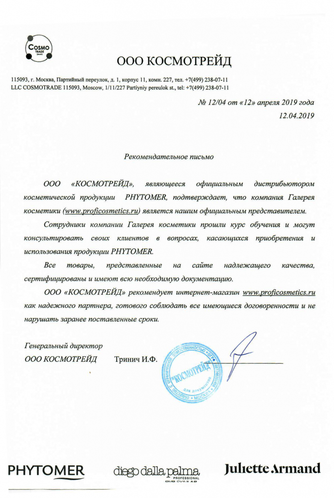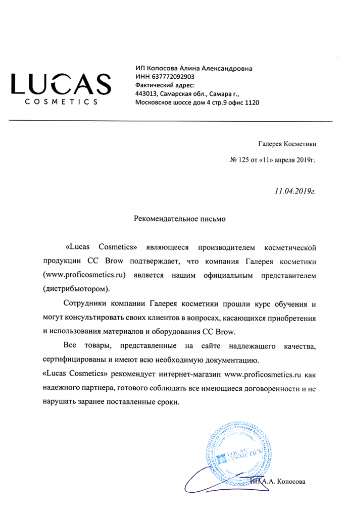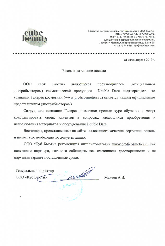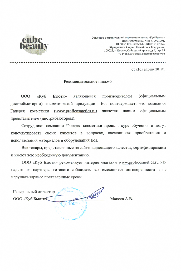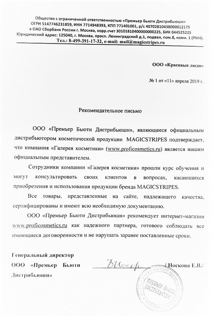 Вы можете ознакомиться с представленными нами официальными партнерскими письмами от ведущих торговых марок бьюти-индустрии, которые рекомендуют «Галерея косметики» как надежного партнера.