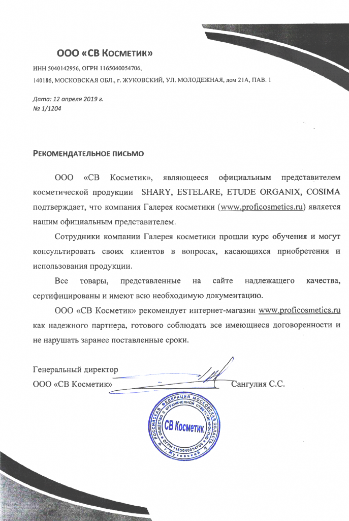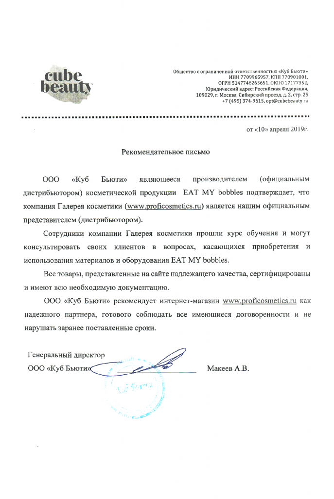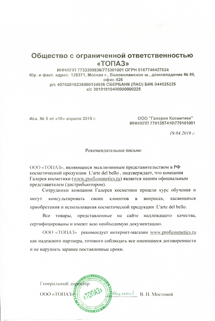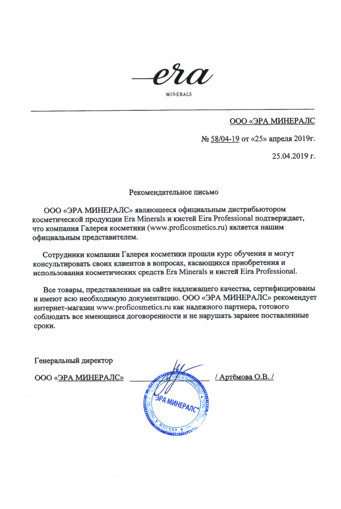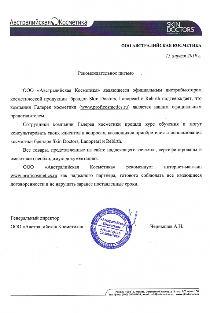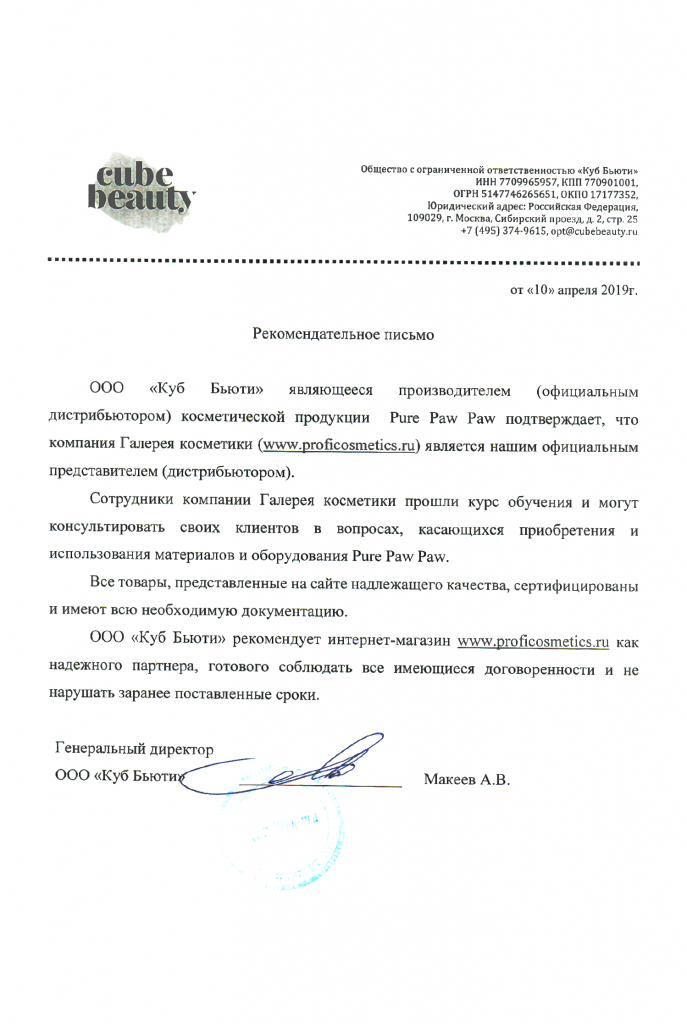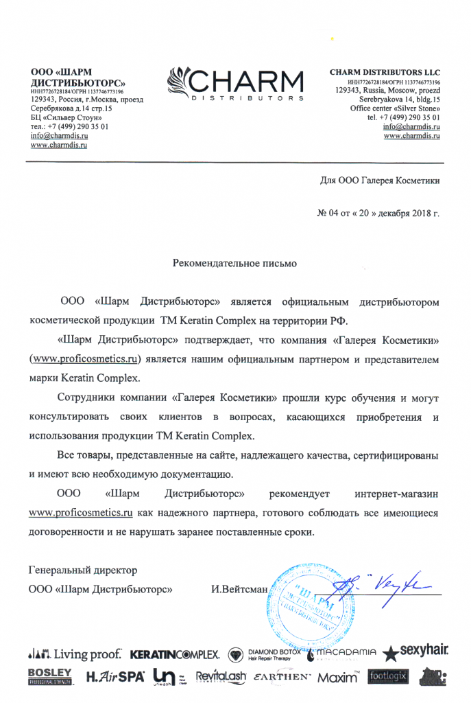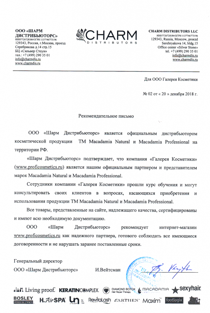 Вы можете ознакомиться с представленными нами официальными партнерскими письмами от ведущих торговых марок бьюти-индустрии, которые рекомендуют «Галерея косметики» как надежного партнера.