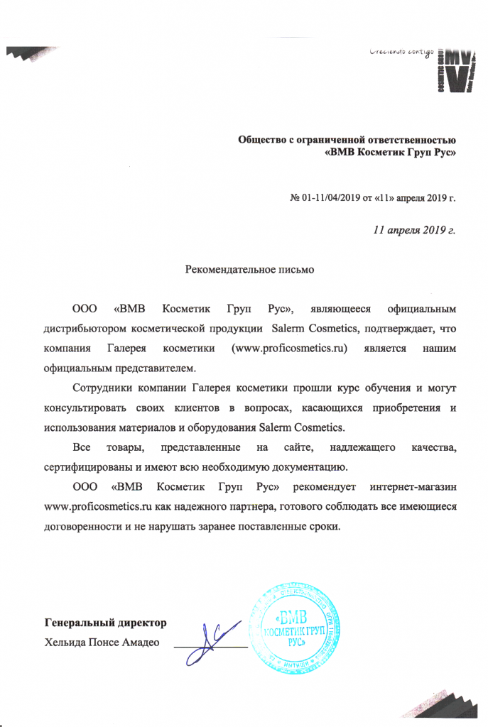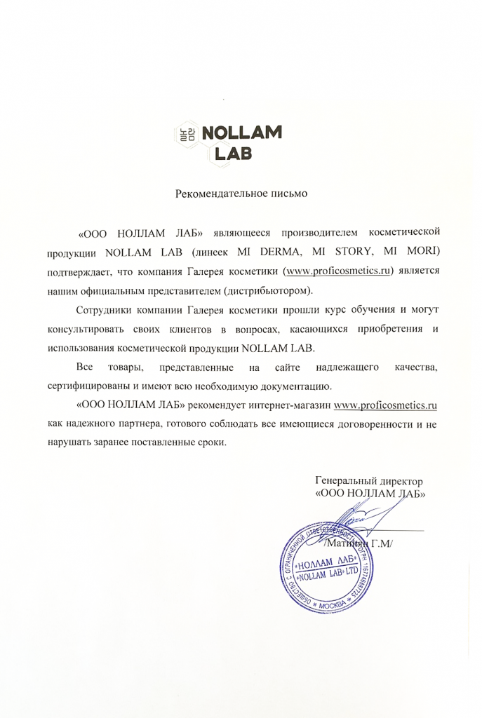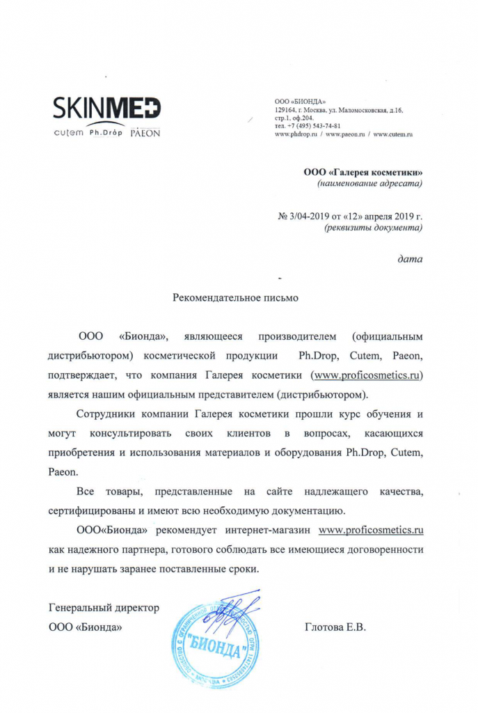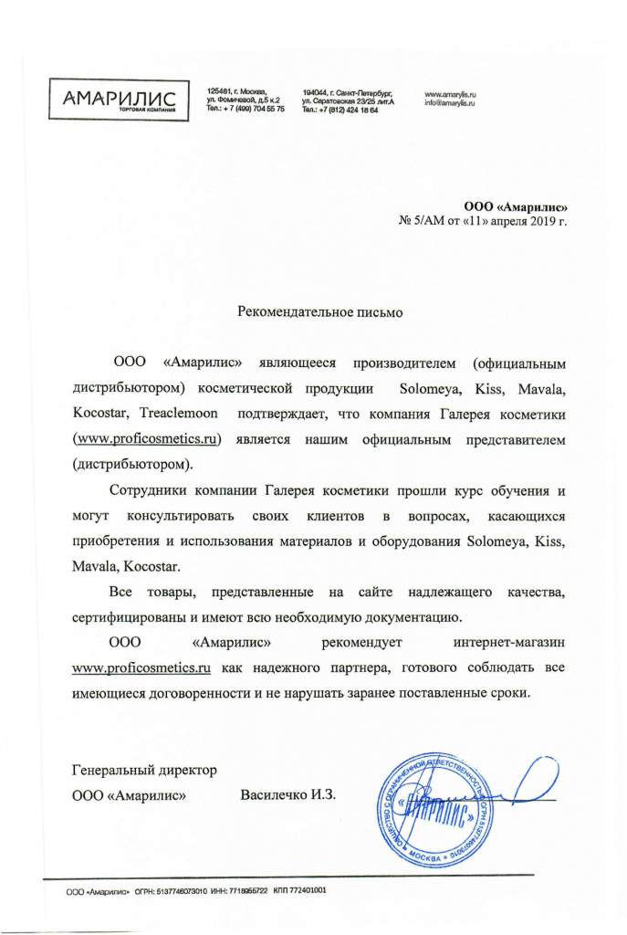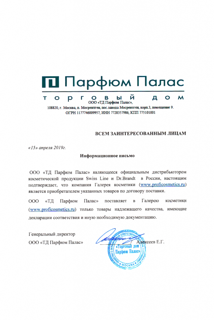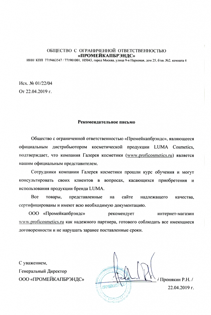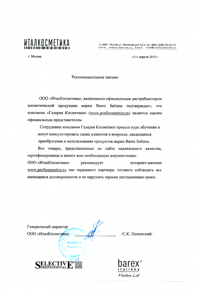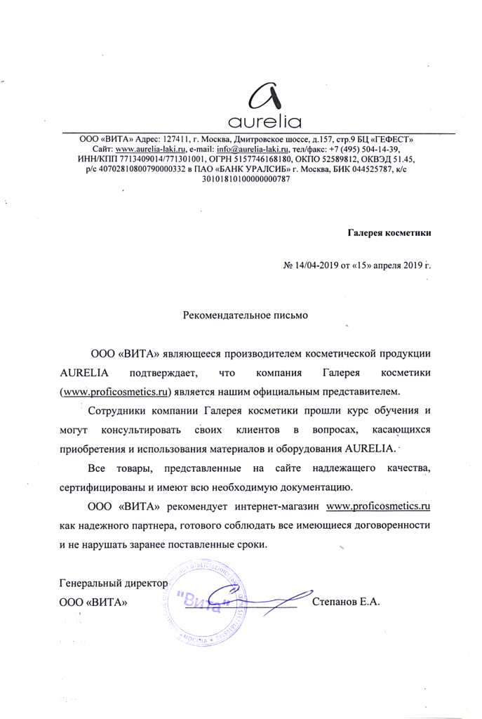 Вы можете ознакомиться с представленными нами официальными партнерскими письмами от ведущих торговых марок бьюти-индустрии, которые рекомендуют «Галерея косметики» как надежного партнера.